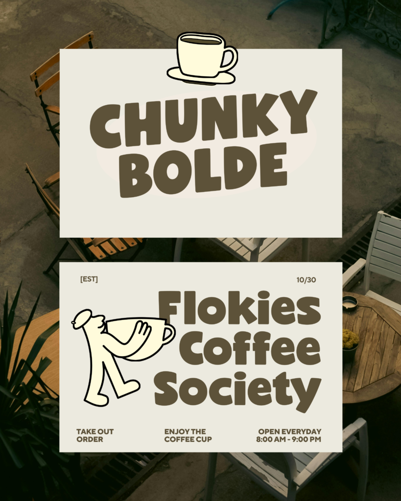 Its bold and thick letterforms create strong visual impact. Chunky Bolde is perfect for cafés with a modern, playful, or urban identity.