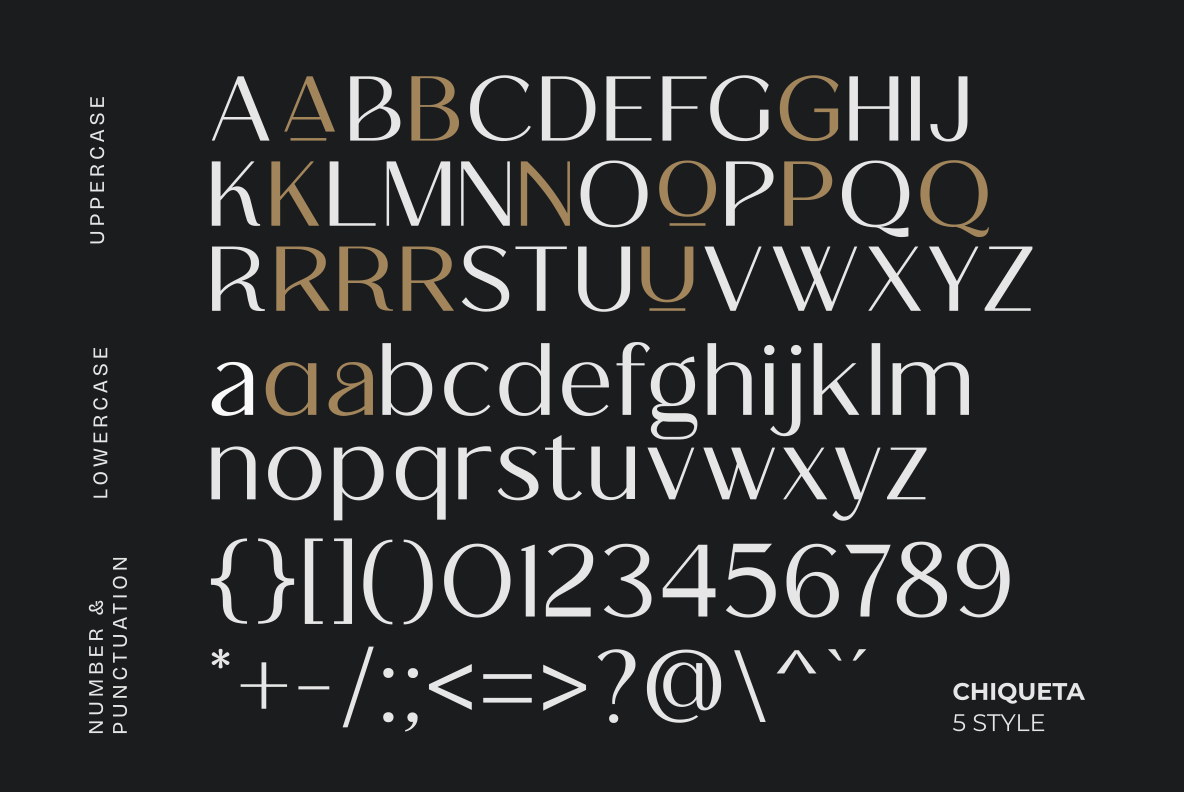 Crafted with unique character shapes, stylish ligatures, and a luxurious aesthetic, Chiqueta stands out in fashion branding, editorial layouts, logos, and premium product packaging. With 5 versatile styles, it offers creative flexibility while maintaining a consistent and graceful appearance across all uses.
