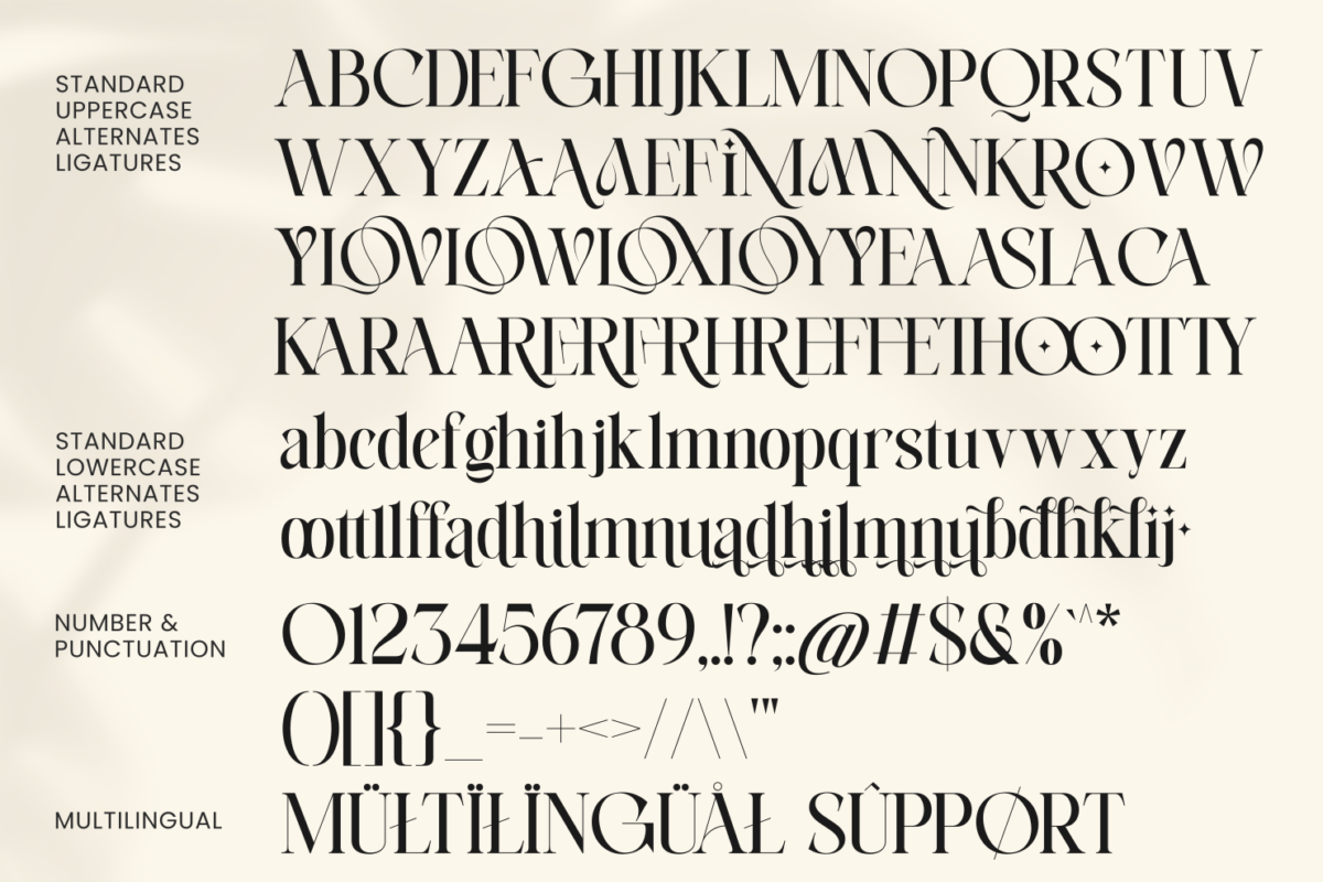 Its distinctive letterforms feature flowing swashes and delicate details, making it ideal for high-end branding, fashion editorials, logos, wedding invitations, and premium packaging. The artistic ligatures and stylish alternates add a unique personality, allowing designers to create truly standout typography.