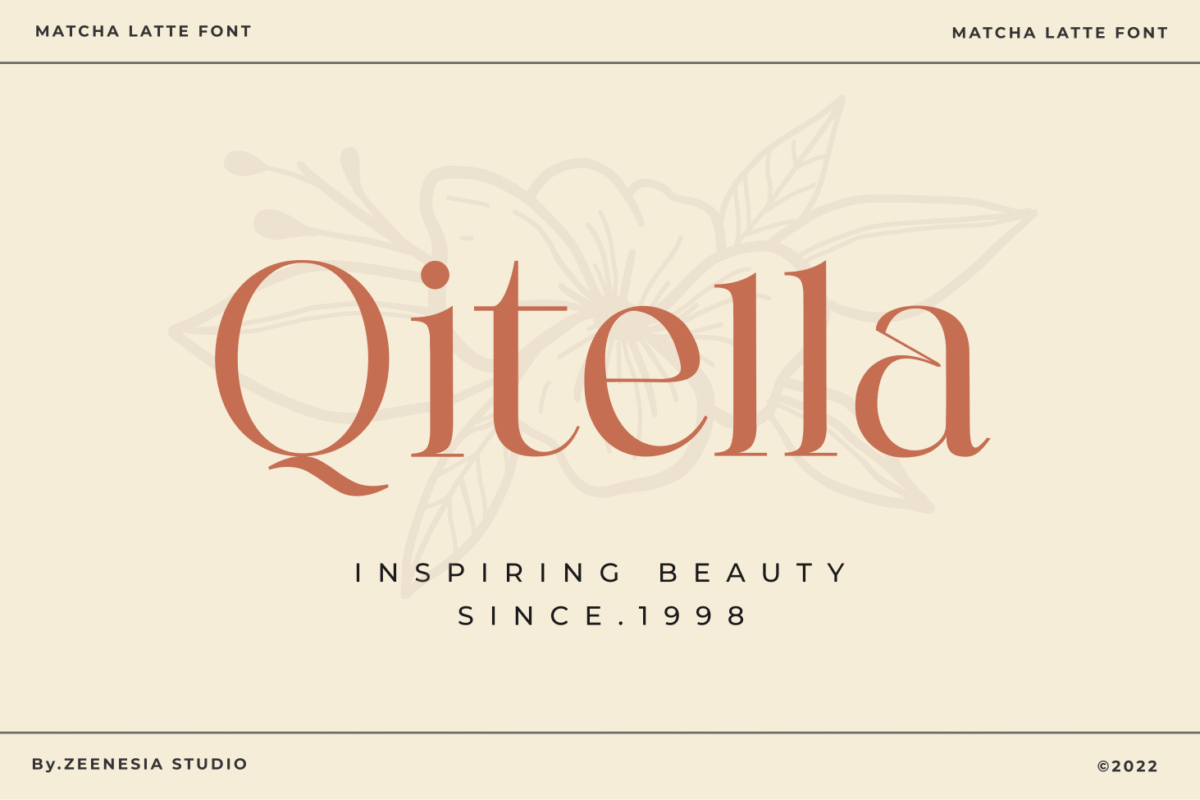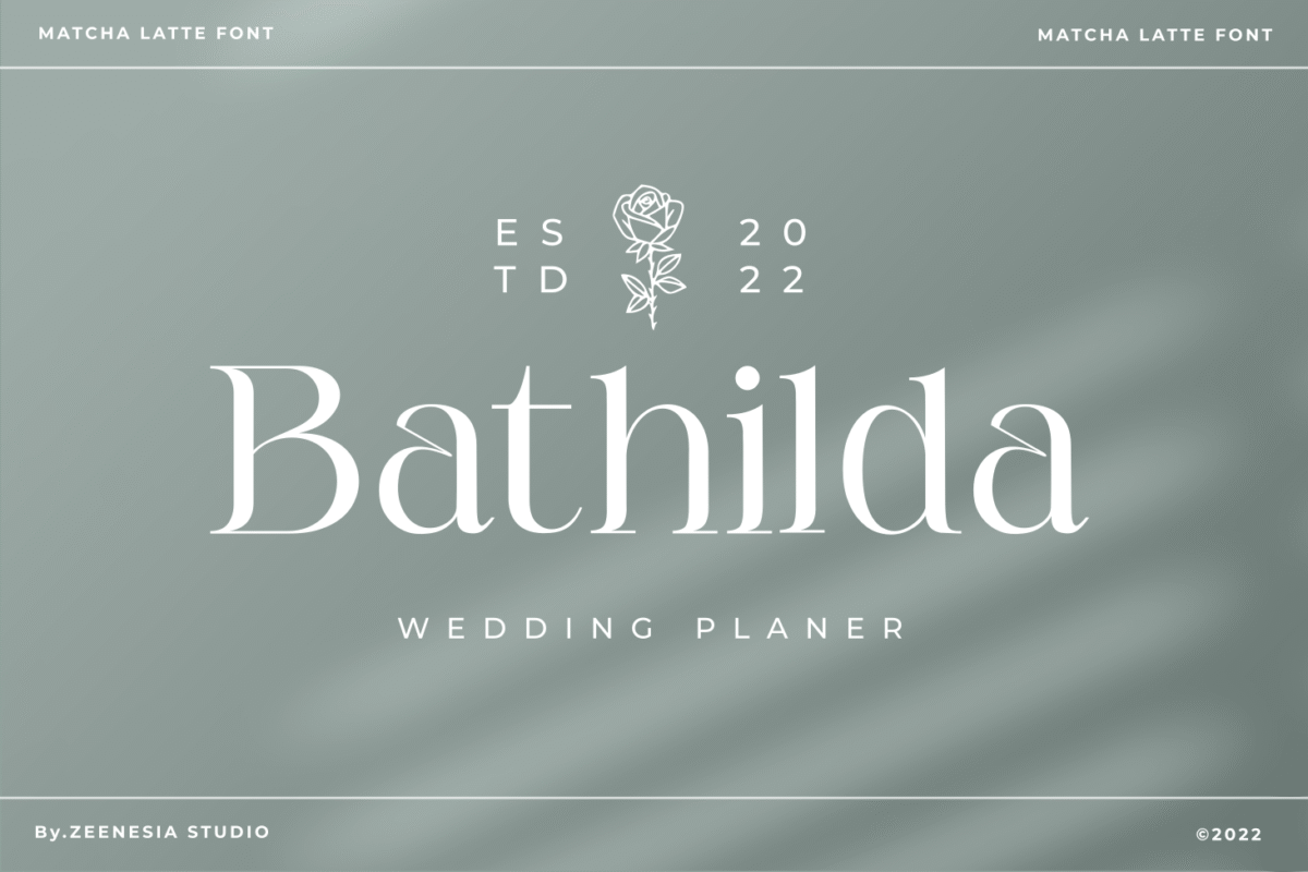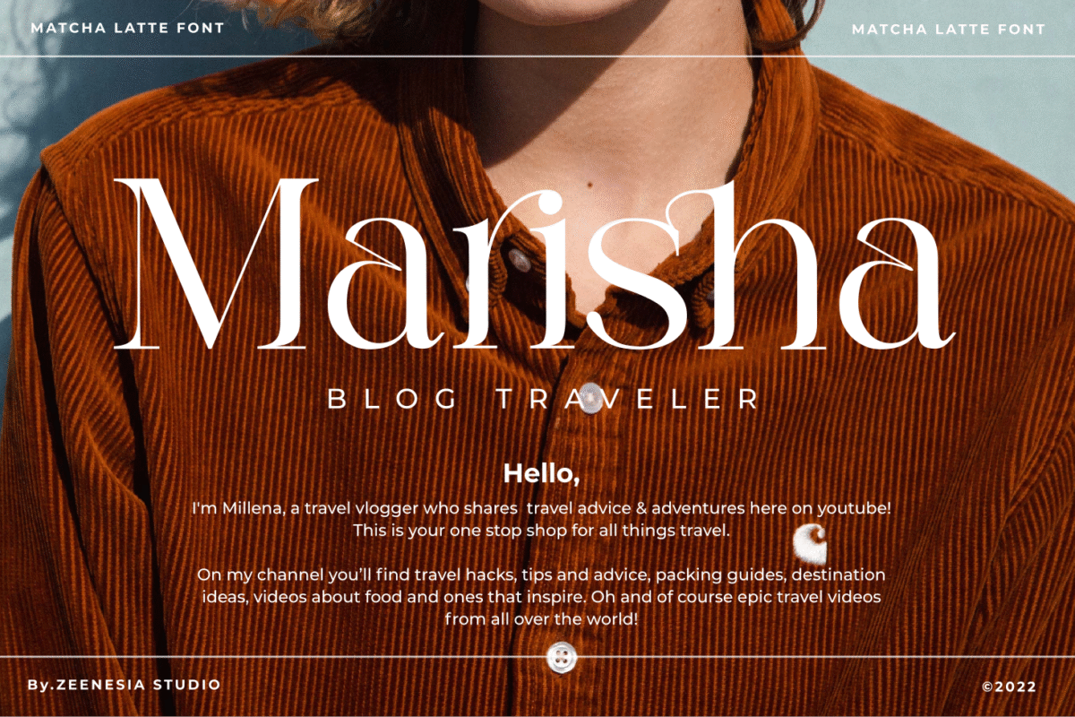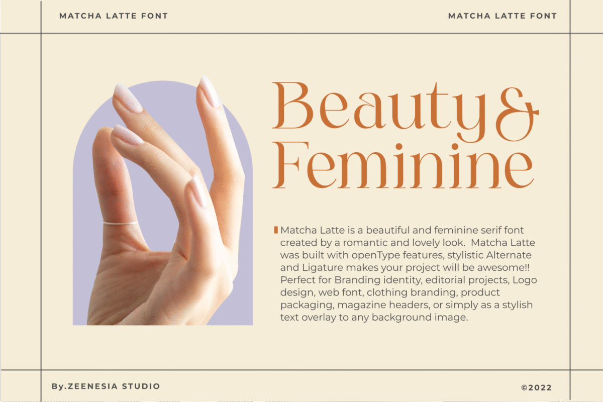Matcha Latte is a beautiful and feminine serif font specially crafted to give a romantic and lovely look to your designs. It is suitable for branding identity, editorial projects, logos, websites, clothing brands, product packaging, magazine headers, or simply as a stylish text overlay to any background image.