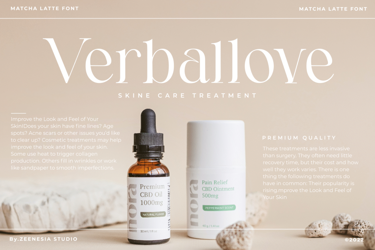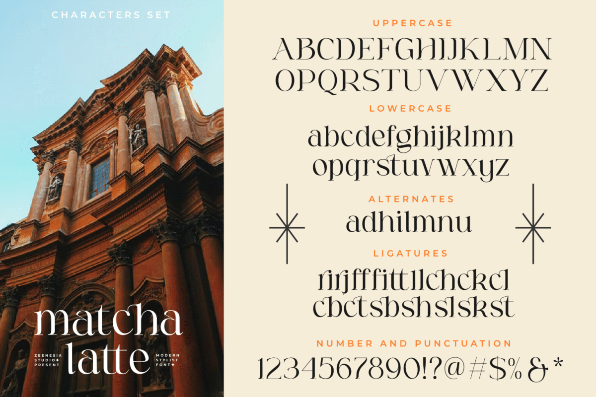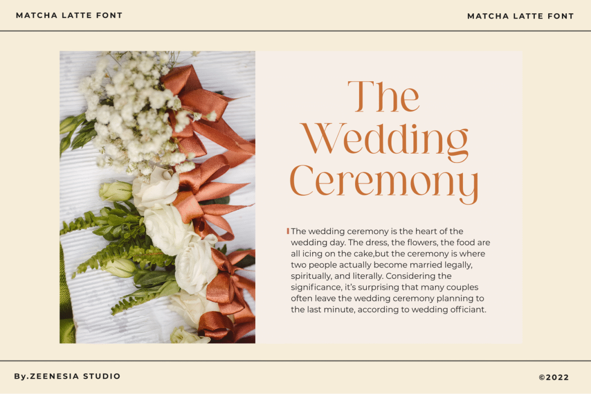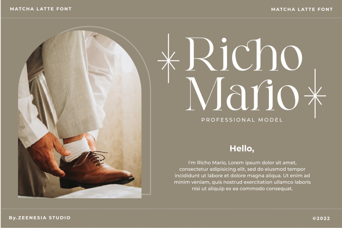 Matcha Latte is a beautiful and feminine serif font specially crafted to give a romantic and lovely look to your designs. It is suitable for branding identity, editorial projects, logos, websites, clothing brands, product packaging, magazine headers, or simply as a stylish text overlay to any background image.