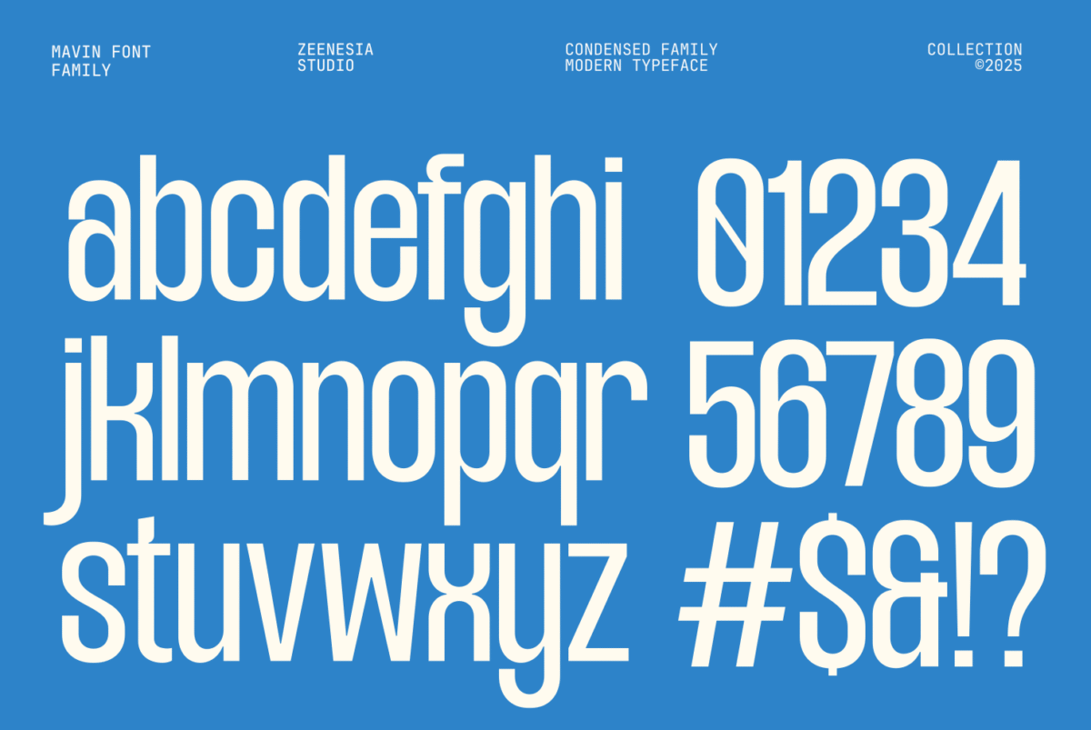 Mavine is a bold and modern condensed typeface family designed for powerful visual impact. With its tall proportions, sharp geometry, and confident personality, Mavine delivers maximum presence in minimal horizontal space.
