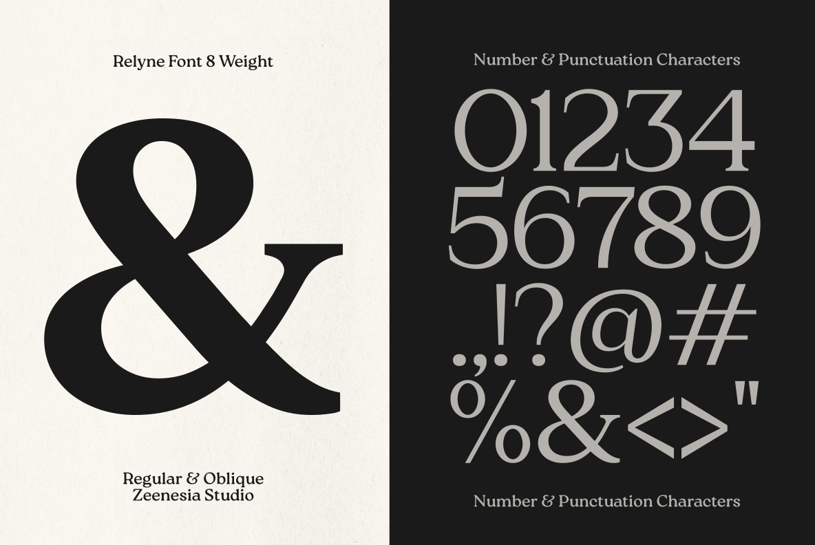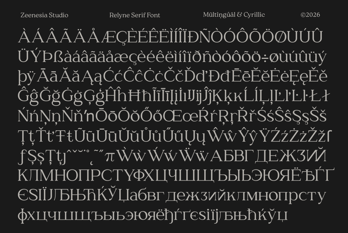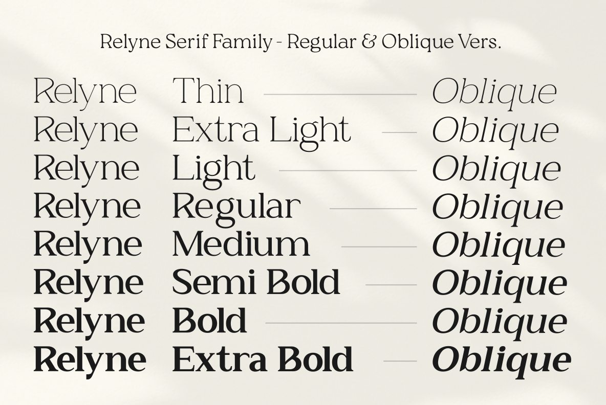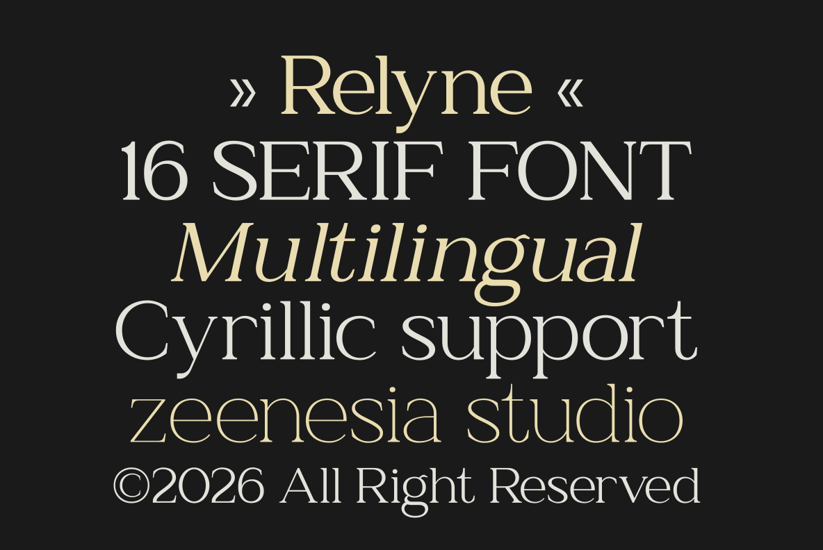 Relyne – A Family Serif Font. Relyne is an elegant serif font family designed with a timeless yet modern character. This typeface consists of Regular and Oblique versions, offering flexibility while maintaining a clean and cohesive typographic style. Relyne offers a complete family of 16 fonts, making it suitable for a wide range of design needs from editorial layouts and branding. Relyne also includes Multilingual Support and Cyrillic characters.
