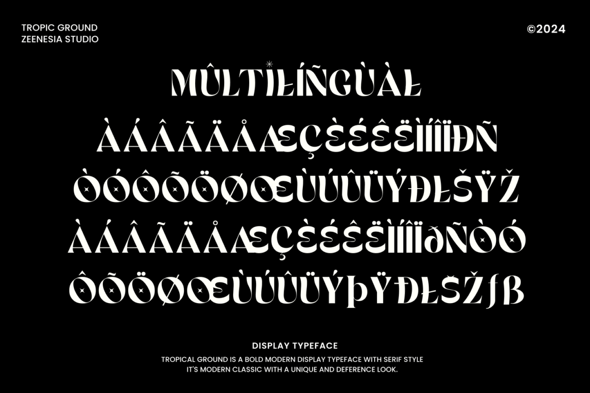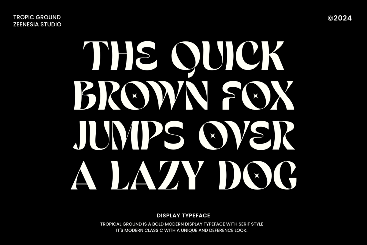 Tropic Ground is a unique display font with serif style. It’s modern and classic font with a unique and deference look . Perfect if you need a dose of fun in your project. Perfect for editorial projects, Logo design, web font, clothing branding, product packaging, magazine headers, or simply as a stylish text overlay to any background image.
