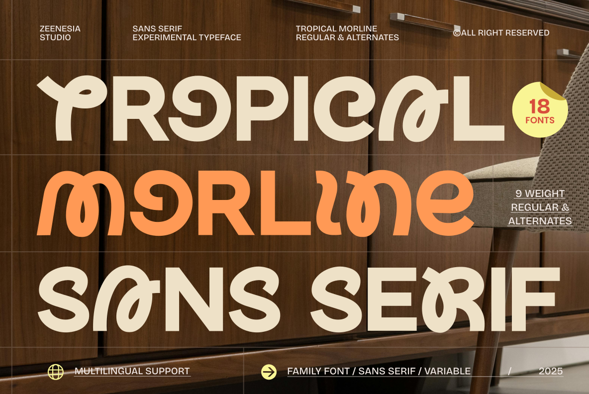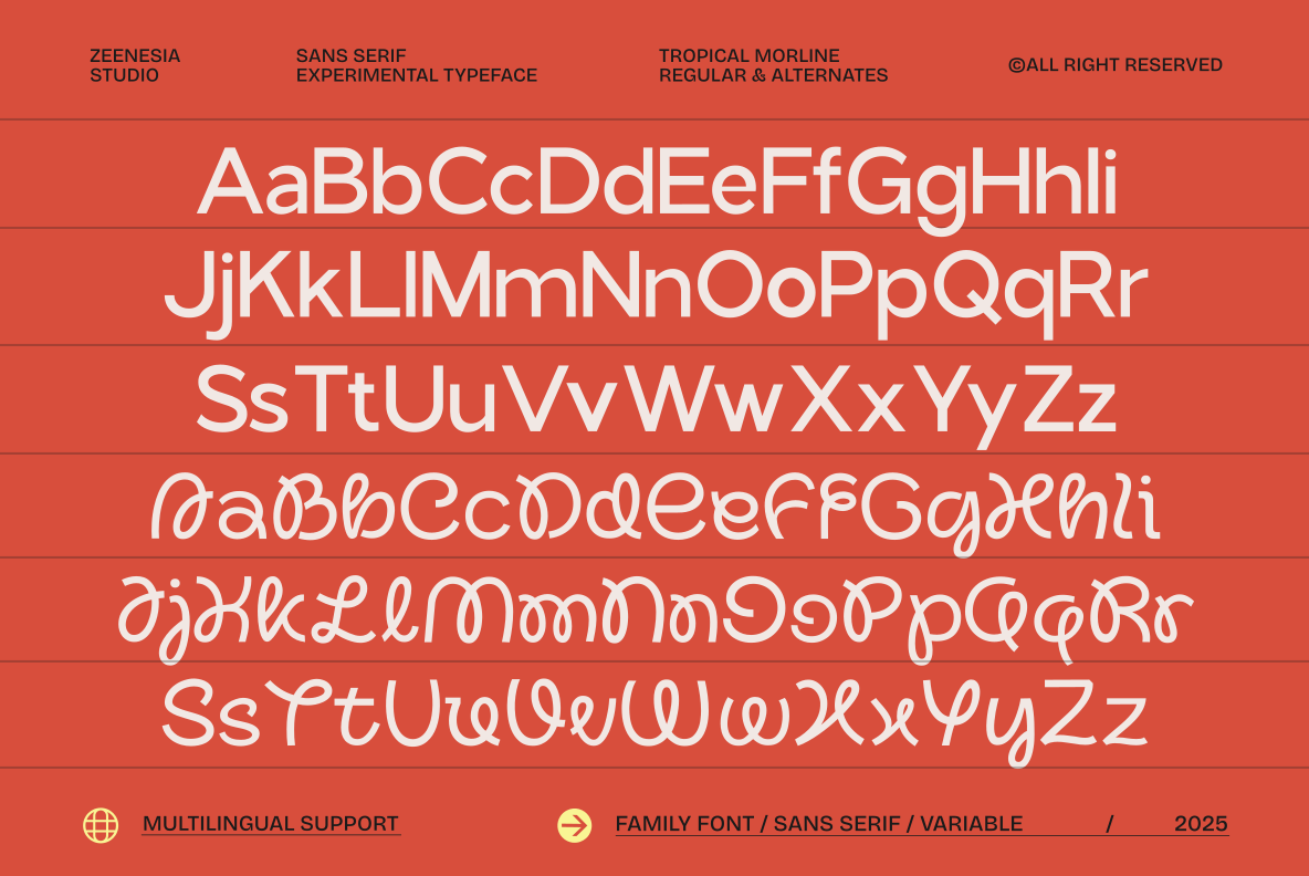 With rich alternate characters and carefully crafted letterforms, Tropical Morline allows designers to create dynamic, eye-catching compositions while maintaining strong readability and a decorative yet modern feel.