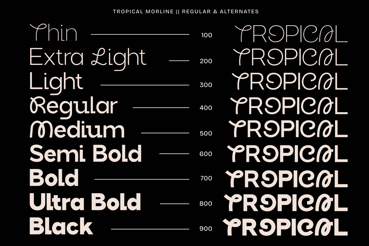 – Tropical Morline Alternate (Thin, Extra Light, Light, Regular, Medium, Semi Bold, Bold, Extra Bold) (OTF/TTF)